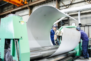 金属板やパイプ、形鋼などを円筒形や曲面に巻き付ける加工。